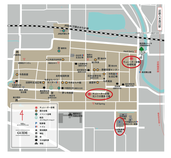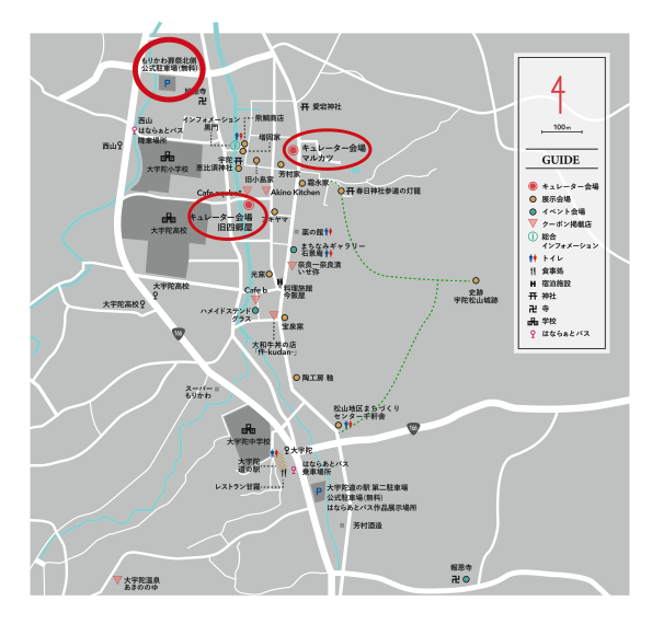 第5回目となる今年の「はならぁと」は、奈良県内で3ヶ所ある「重要伝統的建造物群保存地区」の全てが会場となっており、地域ごとの歴史や町並みの特徴をより強く感じることができる内容となりました。メイン会場となる「こあ」エリアでは、キュレーター・作家は積極的に町に滞在し、町との対話を通じて展示を企画実施します。