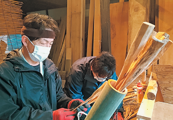 大かがり火に点火する大松明、火を運ぶ小松明、点火用の松明を担当職員が約2カ月かけて手作りします。大松明と小松明の材料となるのは、油分が多く火持ちがいいクロマツの根。奈良公園内の倒木などから採取し、数年かけて乾燥させたものを1本1本手で削り、木片にして使用します。硬い根っこを約千本もの木片に加工するのは大変ですが、ご先祖様も見たであろう行事の松明づくりを任されているという使命感と誇りを持って取り組んでいます。