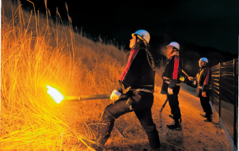 奈良市内の消防団員約300人が、所属分団の担当エリアに分かれ、消防局や県職員の方と連携を取りながら一斉に点火作業を行います。山焼きにとっての大敵は風。とくに山頂エリアは春日山原始林に延焼しないよう、毎年点火するかどうか直前まで検討します。