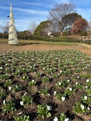 カフェレストラン前の花壇では、パンジーを植栽しております。「彩りの広場/北エリア」