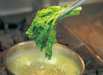 菜花は根本の硬い部分を切り落とし、塩茹でする。葉っぱの緑色が濃くなったら取り出す。