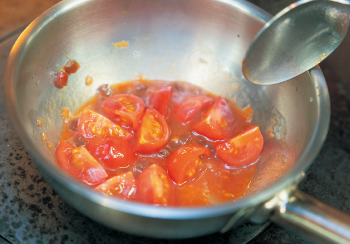 2の具材を取り出したフライパンにオリーブオイルを引き、ニンニクを加え、香りを出す。ミニトマト、タマネギ、アンチョビを加えて炒める。奈良漬、ケチャップ、奈良漬の酒粕、水を加え少し煮る。